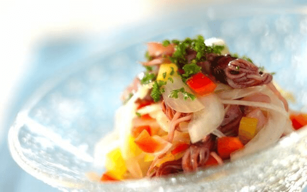 ワカメとホタルイカを合わせたサラダ。海の幸にはワサビじょうゆの味付けがよく合います。噛み応え抜群でさっぱりとした後味は、箸休めとしても最適。焼き魚や天ぷらなど和のおかずと合わせて定食風にするのも良いですね。
