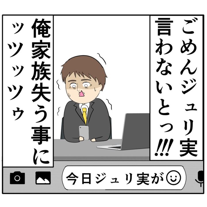 最悪の展開を想像したろみ緒さんは「ごめんジュリ実。言わないとっ!!!俺家族失うことにッッ」と震えながら「今日ジュリ実が」とめいさんにメッセージを打ち始めました。