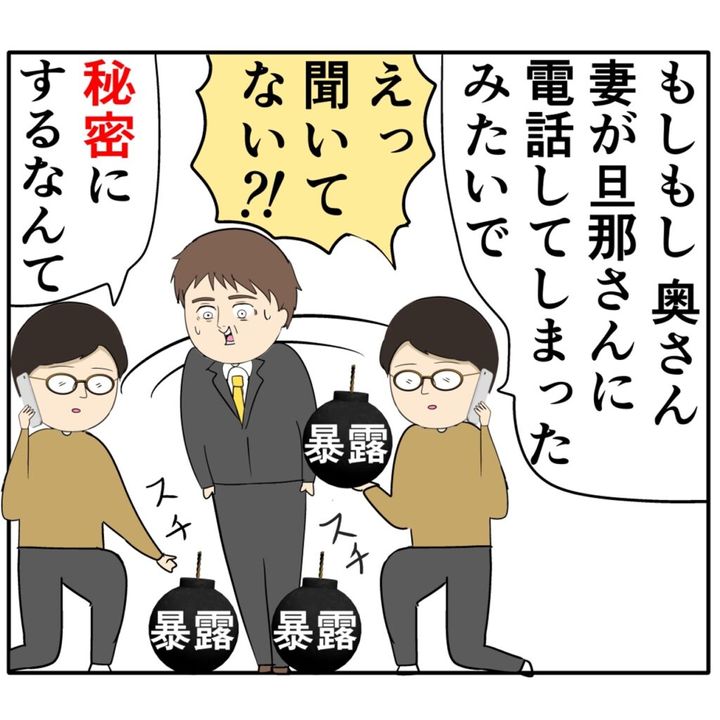 これまで何度もジュリ実さんの夫経由でめいさんに知られたくないことを暴露されてきたろみ緒さんは、自分がめいさんに報告しなかったとしてもまたジュリ実さんの夫経由でめいさんにバレて余計にピンチになると考えました。どんどん悪い妄想が膨らんでいくろみ緒さん・・。