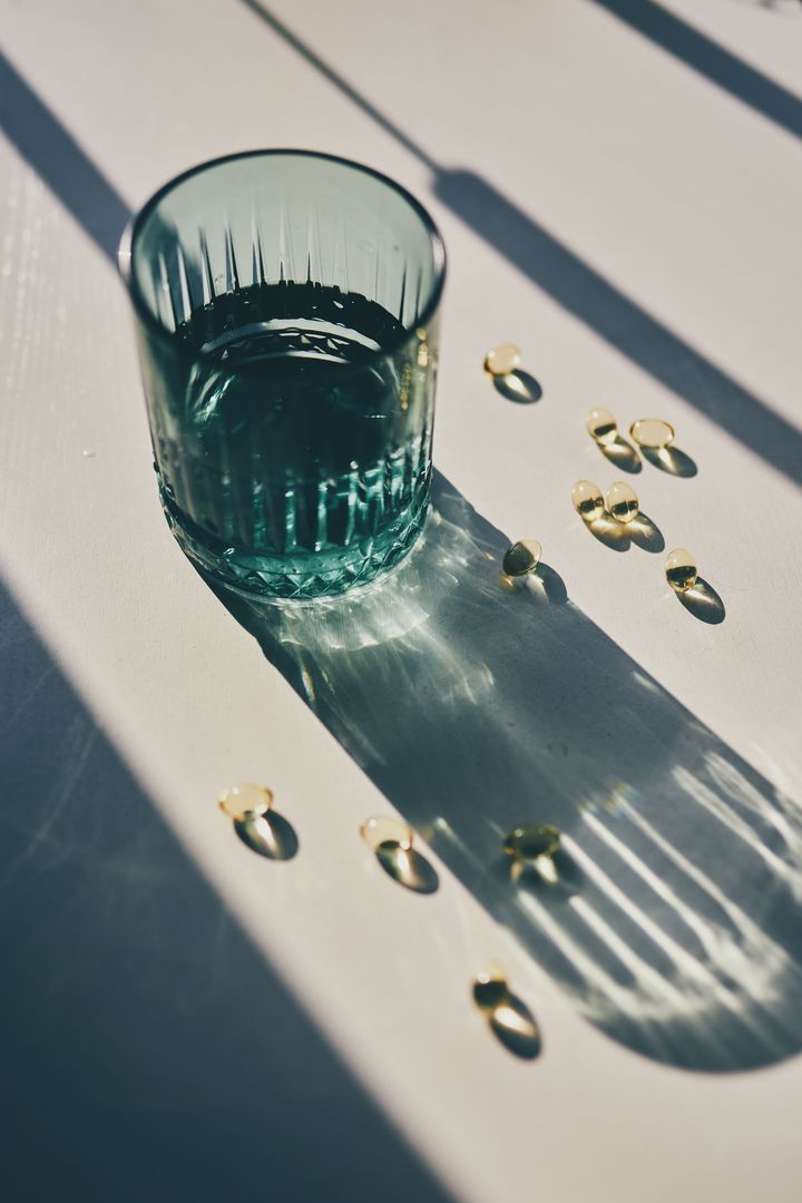 Vitamin pills spilled beside green glass bottle