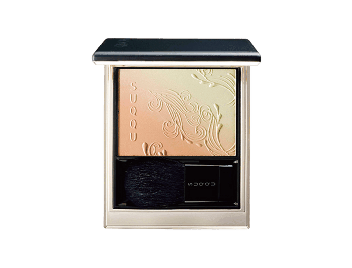 【e】アプリコットピンクとグリーンのニュアンスが漂うベージュのグラデーション。SUQQU ブラーリング カラー ブラッシュ 106 ¥6,600(SUQQU)