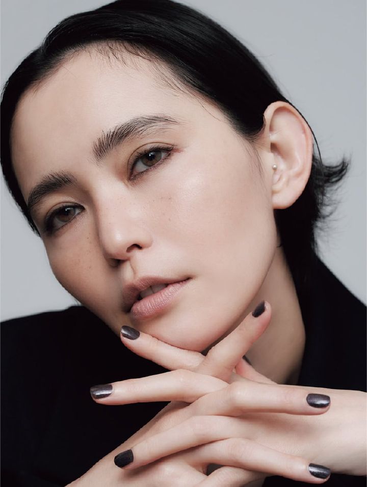 ブルーニュアンスのまるでガラスのようにクリアな瞳には、グレーシャドウでクールな雰囲気を楽しんで。囲み目も怖い印象にならず、マニッシュな中に女性らしい柔らかなニュアンスも見え隠れする表情に。