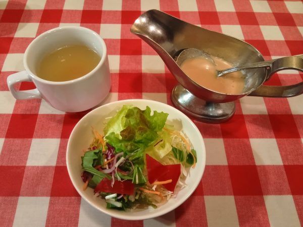 セットのサラダとスープ。ドレッシングの容器もかわいい。ドレッシングも自家製かな?おかわりしたいほど美味しかったです。