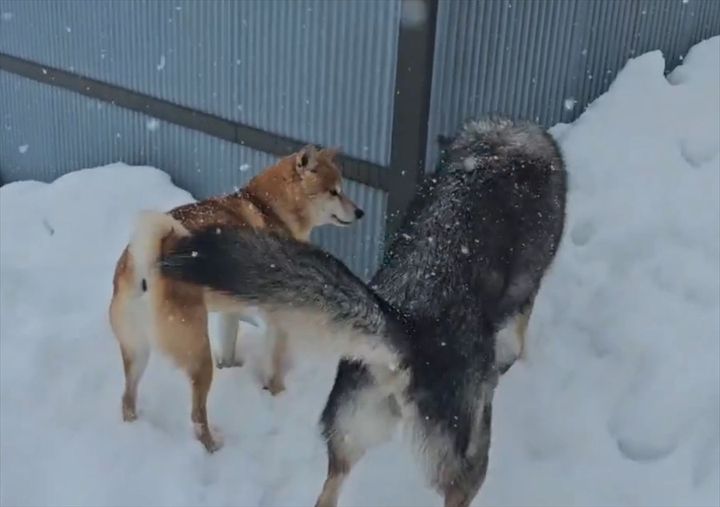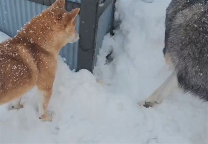 雪原の中、パイナップルのオモチャを落としてしまい、落胆していたのは柴犬の『みみ』ちゃん。 そんなみみちゃんのもとへ、狼犬の『ディオネ』ちゃんが駆けつけてくれました!
