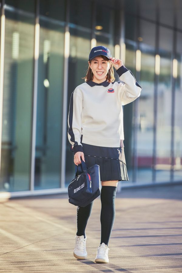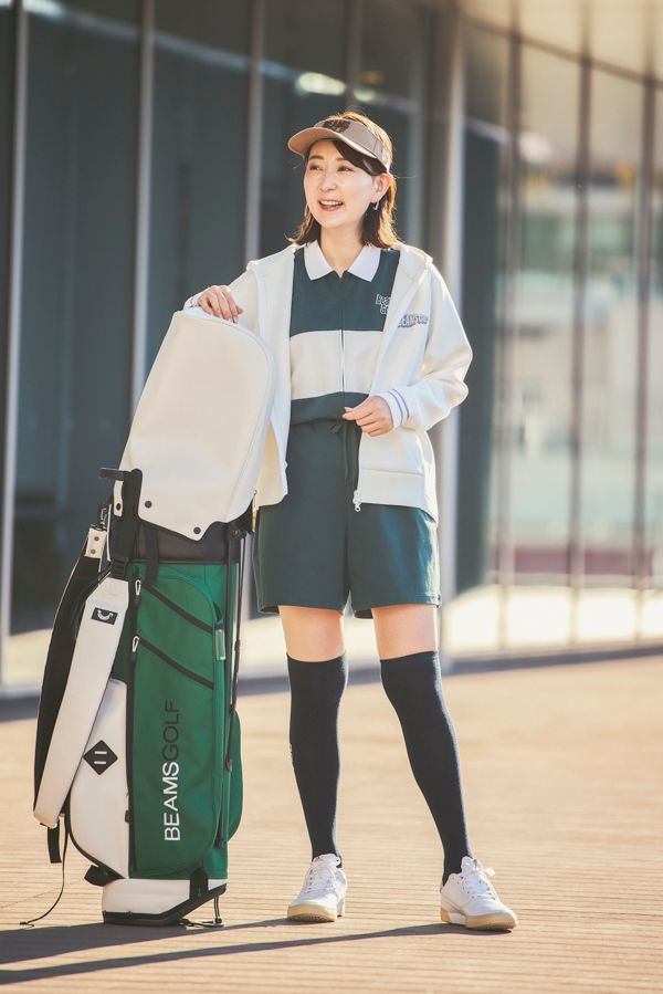 襟付きトップス¥22,000、スカート¥20,900、ニーハイソックス¥2,970、キャップ¥6,600、カートバッグ¥9,900、靴<参考商品>(全てBEAMS GOLF)