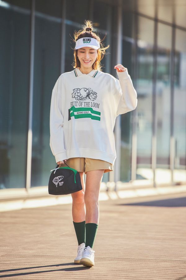 メンズトレーナー¥15,400 (Fruit of the Loom×BEAMS GOLF)、ポロシャツ¥18,700、ショートパンツ¥17,600 、サンバイザー¥7,150、ソックス¥2,640、カートバッグ¥7,700、靴<参考商品>(全てBEAMS GOLF)