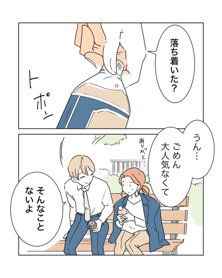 「落ち着いた?」ジュンにそう言われて「うん・・ごめん大人気なくて。ありがと・・」と言うと、「そんなことないよ」とジュンが優しく言いました。