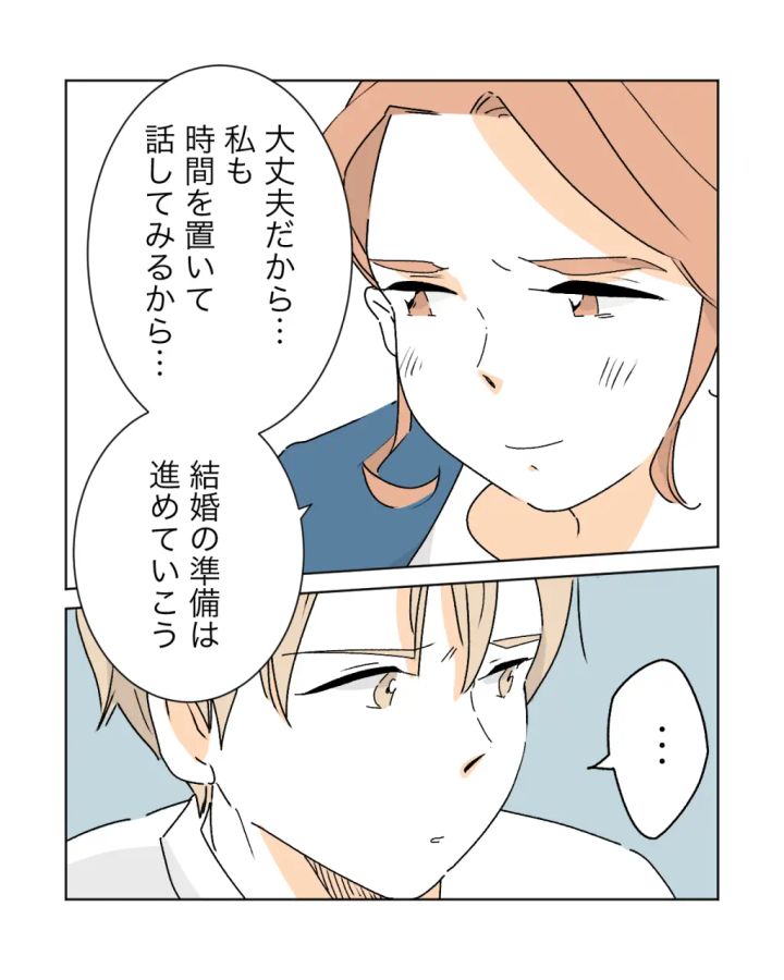 「大丈夫だから・・私も時間を置いて話してみるから・・結婚の準備は進めていこう」と私が言うと、「・・・」ジュンは無言に。
