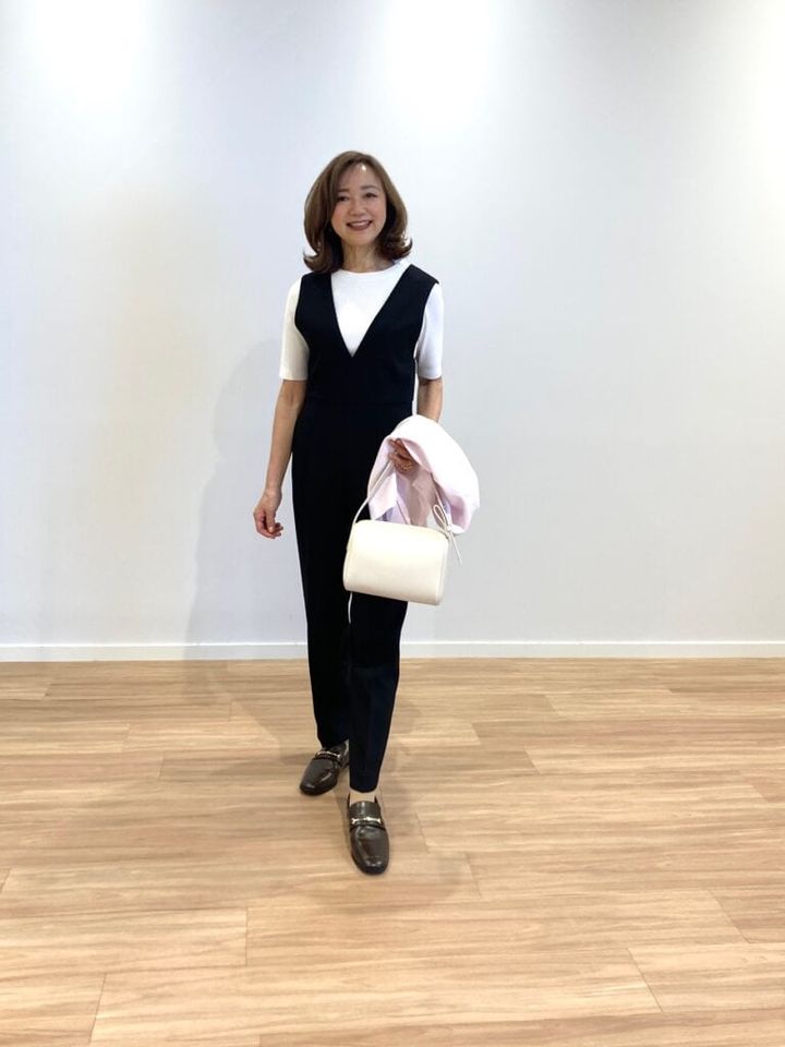 シャープな深めのVネックですっきり感とかっこよさのある「ダブルクロスジャンパースーツ」。ウェスト位置が高く、テーパードシルエットで脚を細くすっきりと見せてくれてスタイルアップできる1着です。きちんと見えしつつ、自宅で洗濯できるお手入れのしやすさも嬉しいポイント! 「ジャンプスーツはカジュアルなイメージで、大人が着れるのかな?と思っていました。でもこれはきちんと感が出ていて、お仕事やランチ会などにもぴったりですね」(鈴木さん)