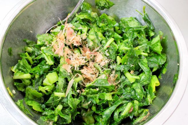 かつお節を加えることで、大根の葉の青臭さが抑えられ、旨味と香りが豊かになりますよ。まんべんなくかつお節が混ざれば、完成です。