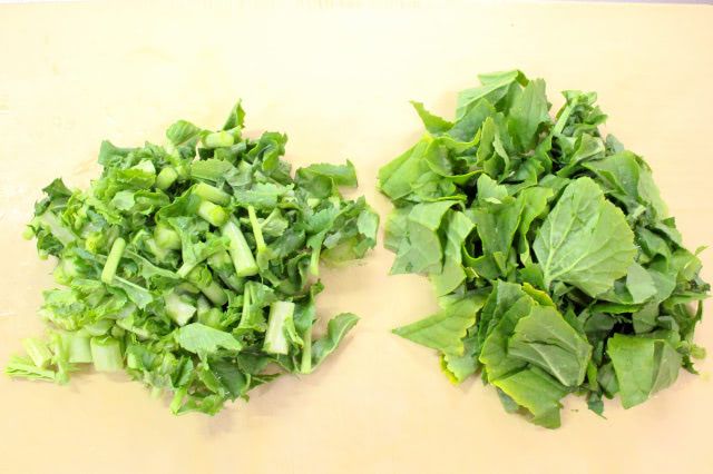 1. 葉をきれいに洗って水気を切り、茎をざく切りに、葉は縦と横に切り目を入れて、ざく切りにします。