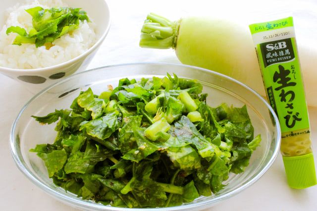 ご飯に乗せて食べてみると、大根の葉の苦味と共に、わさびの風味がふんわり。かつお節も混ざり、大人っぽい味わいですが、葉がほぼ生。