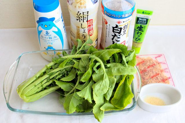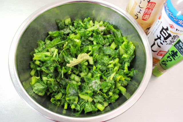4. ボウルに、水気を切った葉を入れます。しょうゆ、白だし、砂糖、わさびを加えてよく混ぜます。