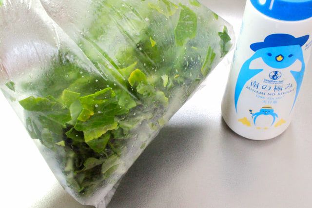 2. ポリ袋に茎、葉、塩を入れます。袋を振って塩をなじませたら、空気を抜いて袋の口を閉じ、重石をして1時間ほどおきます。