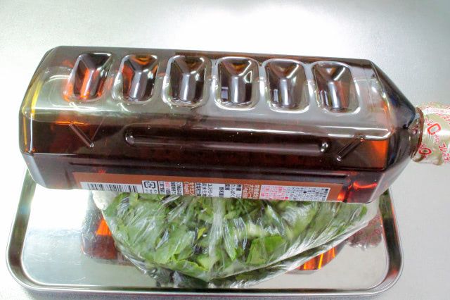 1kgぐらいの重石が目安とのことですが、今回は葉が半量。そこで、800g入りのゴマ油のペットボトルを乗せて、1時間おきました。