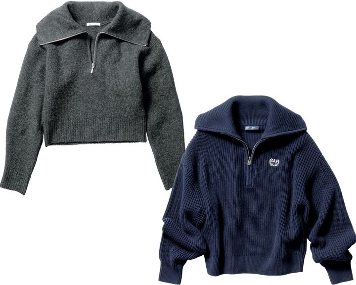 ニットやスウェットはハーフジップデザインのものが今年らしい。首元を縦に長く開けることで上半身がかなりシュッと見えます。左・顔まわりに直線を作ってくれる大きな衿で顔の輪郭までもシャープに。グレーハーフジップニット¥2,990(GU)右・身幅が細めの設計は着太りを回避。ジップは下まで下げることでより首を長く演出。ネイビーハーフジップニット¥9,990(Gap)