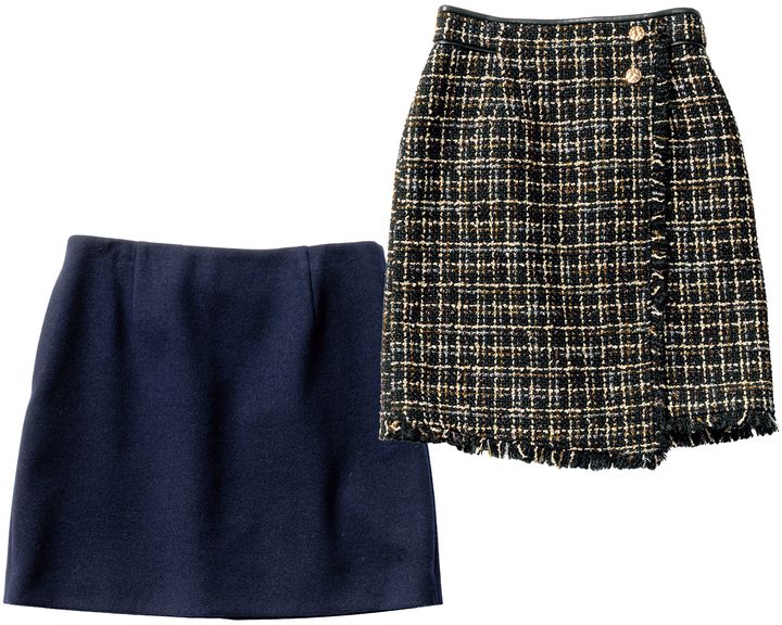 ウェーブタイプは上半身に比べて下半身が逞しく見えがち。ミニスカートで重心を上げることで太ももあたりの太さが目立ちにくく。左・ベーシックカラーで取り入れやすい。アウターを短丈にするとよりスタイルアップ。ネイビースカート¥12,100(ノーク)右・得意のツイードをミニスカで。ツイードラップスカート¥19,800(ジャスグリッティー/ジャスグリッティー プレスルーム)