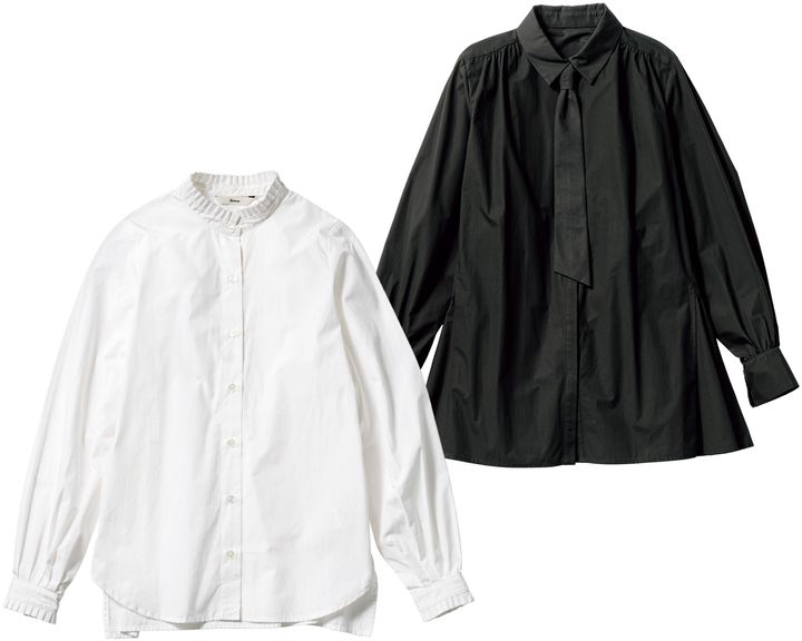 体型に自信がないときは、着痩せ効果を狙えるハリのあるシャツを。得意のデザイン性があるもの、ゆったりとしたものをセレクト!左・スタンドカラーにフリルをあしらった一着。ブラウス¥20,900(アンヌ/バート)右・ネクタイが作る直線でスラリとしたシルエットに。ネクタイ付きシャツチュニック¥22,000(アルページュストーリーオリジナル/アルページュストーリーオリジナル プレスルーム)