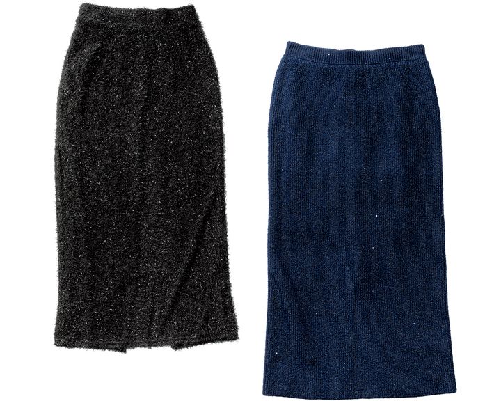 今季のトレンドでハズせない“ ラメもの”。しかもウェーブタイプは大得意! Ⅰラインスカートで取り入れると下半身がほっそり見え。左・素材感のある黒で全身バランスも下半身スッキリ見えも両立。黒ラメシャギースカート¥1,799(GRL)右・ラメが控えめで使いやすい。ネイビーラメニットスカート[ニットトップスセット]¥25,300(ジャスグリッティー/ジャスグリッティー プレスルーム)