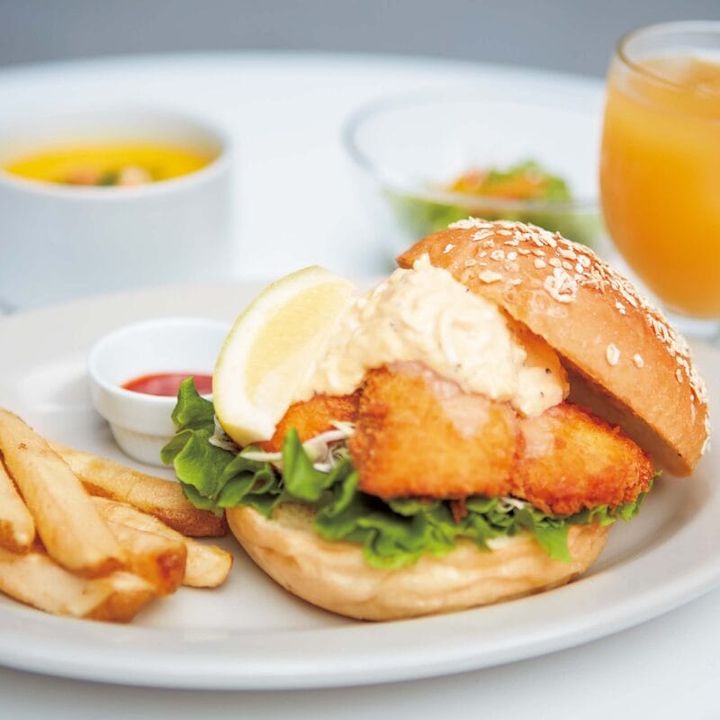 瀬戸内の鯛をカラリと揚げた「鯛カツバーガーランチ」は ¥1,680。鯛出汁を加えたタルタルソースがポイントです。奥の「河内晩柑果汁」(¥400)は「香りの高さに驚き! 東京でも飲みたい!」と神下。