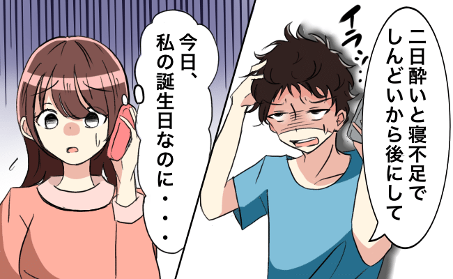 翌朝、スマホを確認すると「ごめん、昨日は友だちとパチンコオールをしていて、誕生日のことすっかり忘れてた。おめでとう」というメッセージが。「友だちとの予定を優先されていたこと」「誕生日をすっかり忘れていたという言葉」にショックを受けて、彼に電話をすると、眠そうな彼が「悪いけど寝不足と二日酔いでしんどいからあとにして」と言われてしまいました。