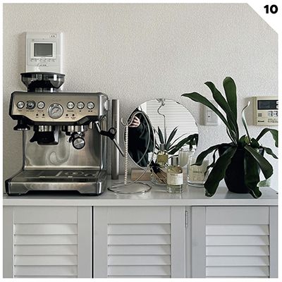 「エスプレッソマシンを置いている白い棚は、実はシューズボックスとして販売されているもの。サイズや仕様がちょうどいいので、わが家ではキッチン棚として愛用しています。木目調とルーバー扉が、部屋の雰囲気をやわらかくしてくれるのがお気に入り」(Jiuさん・会社員)