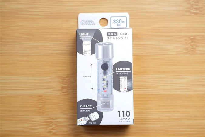 ダイソーの「充電式LED-スケルトンライト」は、電池不要で使用できるLEDタイプのライトです。