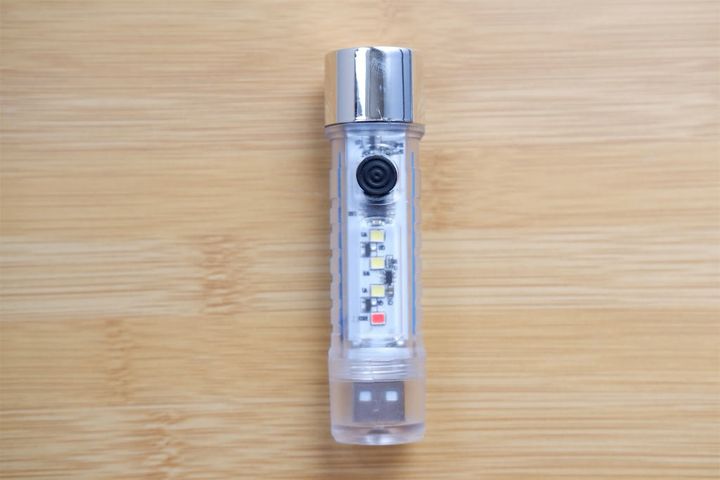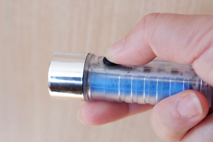 まずはライトモード。本体上部の白色LEDライトが、強・弱・点滅の3種類に光ります。モードの切り替えはスイッチを押すだけです。