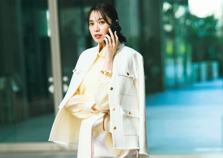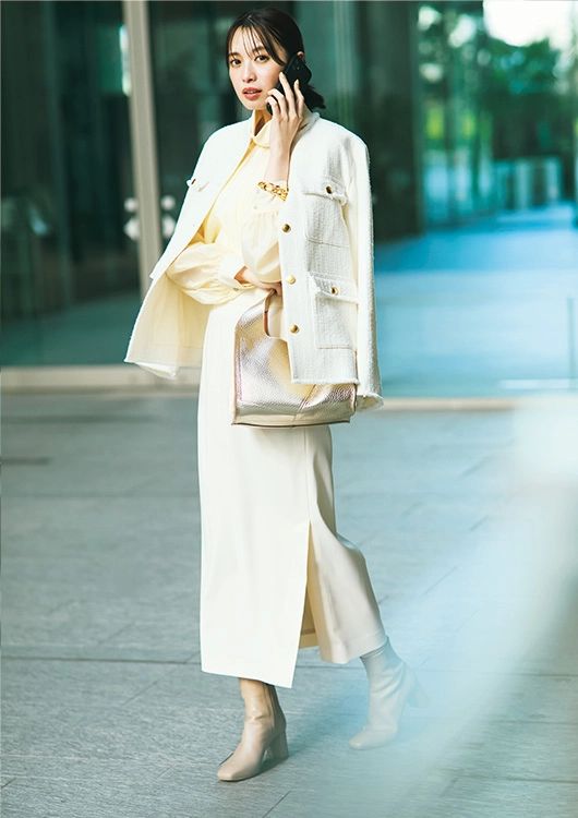明るくHAPPYなムードのイエローブラウス。ほんのり透け感のあるエアリーな質感も春めく秘訣。白のツイードジャケット&スカートで全体をやわらかな表情にまとめると、さらに季節が進む!