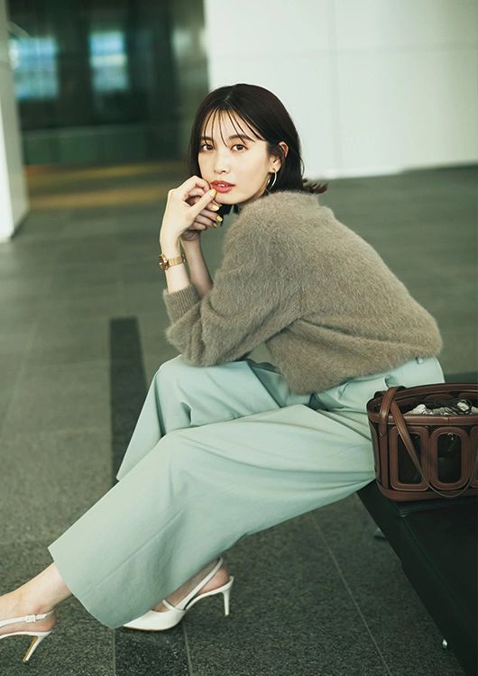 優しい色合いに、とろみ素材etc.軽快なムードを醸すミントのワイドパンツが、ウォーミーなフォックスニットを春顔にイメージチェンジ!クリーンな白パンプスやシアー感のあるバッグも、季節ブリッジに効果的。