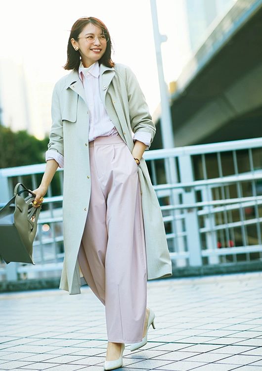 フェミニンなピンクワントーンをトレンチコートでハンサムに!