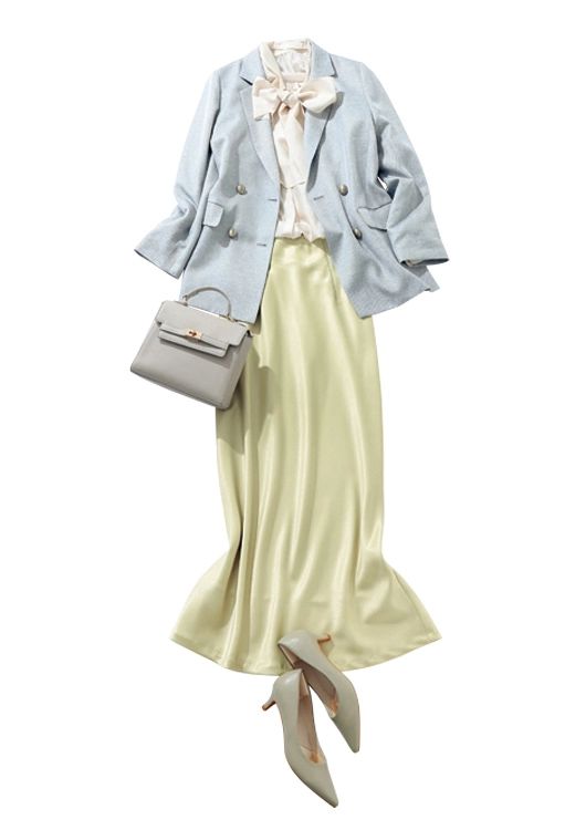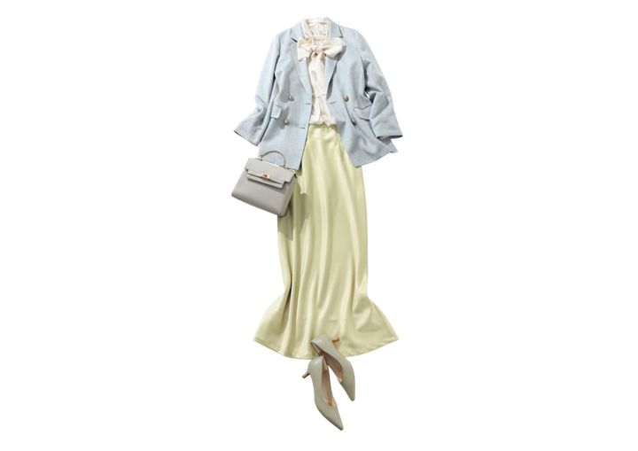 テーラードジャケット¥27,500、サテンナロースカート¥17,600/ともにマイストラーダ ボウタイブラウス¥20,900/ドレステリア(ドレステリア 渋谷スクランブルスクエア店) ワンハンドルバッグ¥3,848/grove(ワールド) ミドルヒールパンプス¥7,700/オリエンタルトラフィック(ダブルエー)