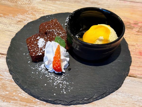 この日はガトーショコラとバニラアイスのマンゴーソースがけ。 デザートも変わるので、事前に知りたい方は注文時に確認してみてくださいね。