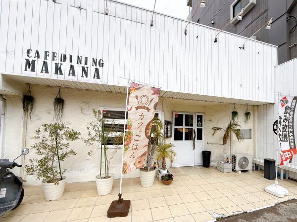 福岡市早良区の荒江四角から原方面へ徒歩1分、国道202号線沿いに「カフェ ダイニング マカナ」があります。 白を基調としたリゾート風の外観が特徴です。