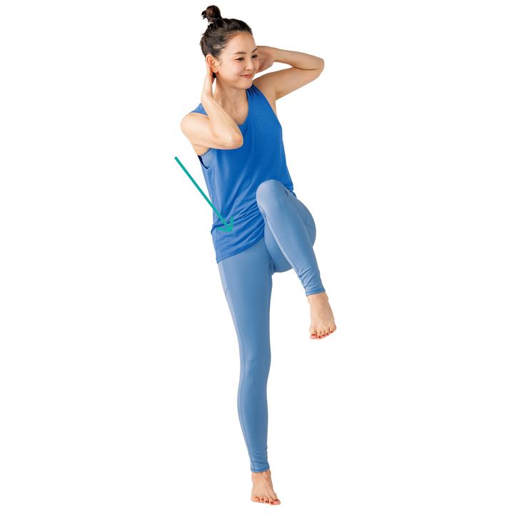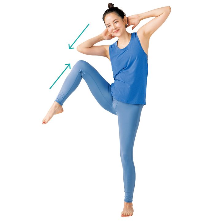 真っすぐに立ち、手を後頭部で組む。体の軸がぶれないよう、肘と膝を脇腹のあたりでできるだけ近づけるように動かす。