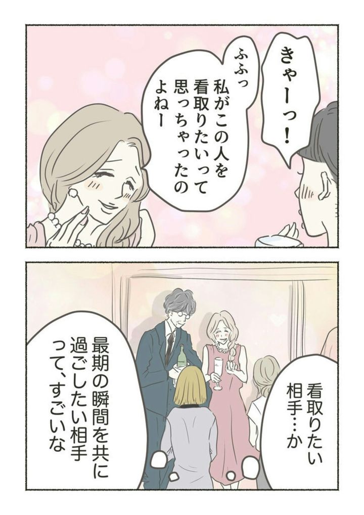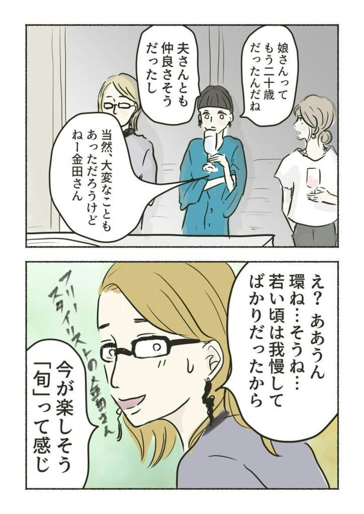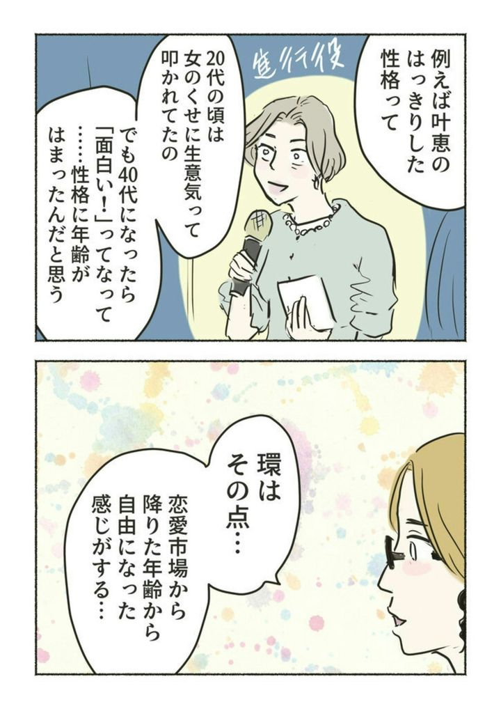 友人・環の再婚パーティーに出席をした際、「年齢に性格がハマる」という話を聞きます。そして、「元美魔女」である環は、年齢を重ね、恋愛市場から降りた今、ようやく「自由になった感じがする」と聞かされます。