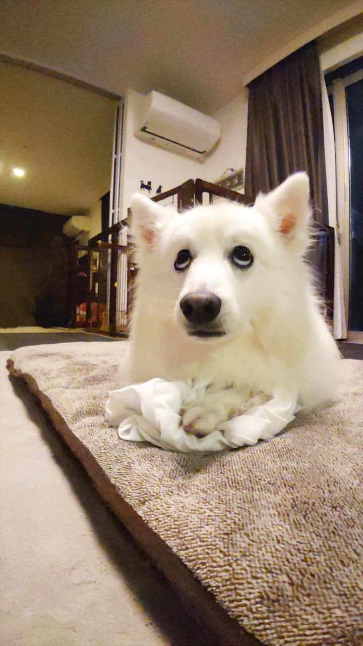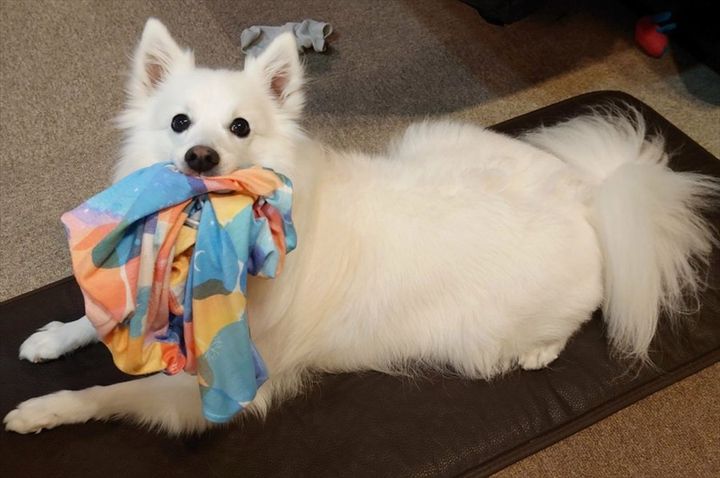 シャツをぎゅっと抱くようにして大事そうに押さえこみ、上目遣いで飼い主さんを見上げているのは、日本スピッツの『楽(らく)』ちゃん。