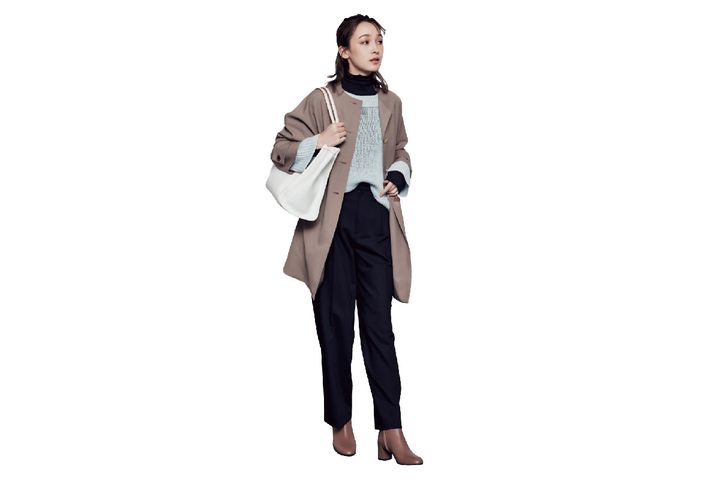 『CLASSY.』着回しDiaryから、おすすめコーデをピックアップ!黒タートルニットと黒パンツの上下ブラックコーデには、淡色ニットをオンして春仕様にアップデート!コートやブーツも春を意識したブラウン系でまとめて。