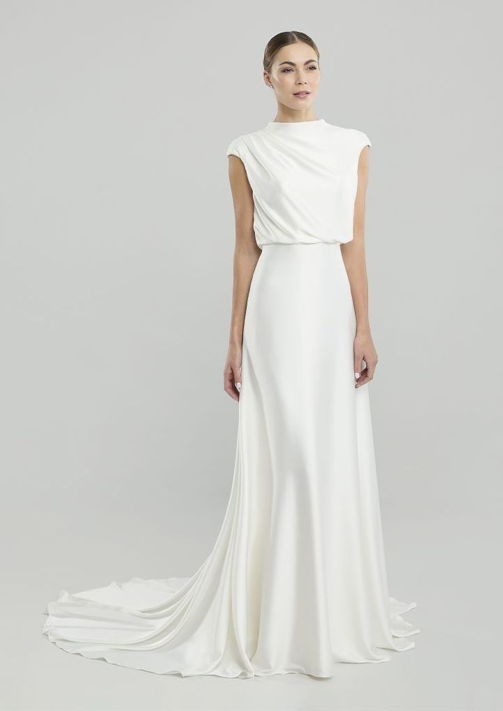 デコルテを覆い、装飾を省いたモノマテリアルドレス。シルクサテンの美しさが際立っています。ヘアスタイルやアクセサリーなどで、花嫁の個性をさまざまに表現できそう! ドレス¥297,000[レンタル価格](プロノビアス/プロノビアス アオヤマ tel.03-3498-0040)