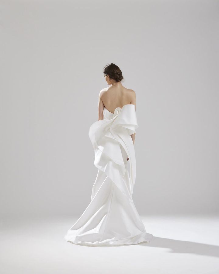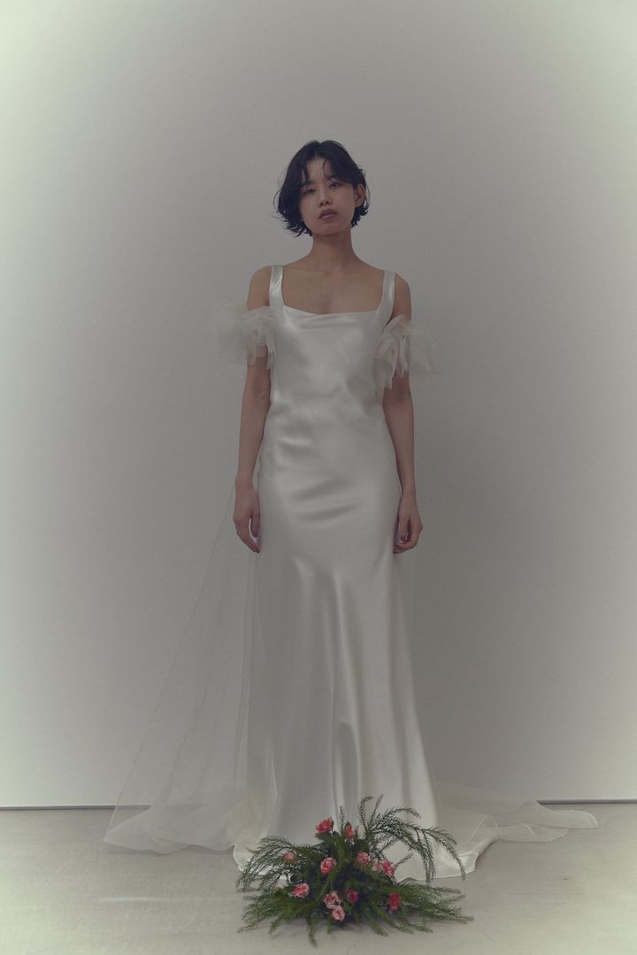 とろんとした落ち感の、シルクの美しさを楽しめるスレンダースタイル。肩口にあしらったオーガンジーの装飾は背中まで連なり、ショルダートレーンのようなデザインになっています。ドレス¥484,000[レンタル価格](オウ・マー/アンテリーベ銀座店 tel.03-5801-5812)