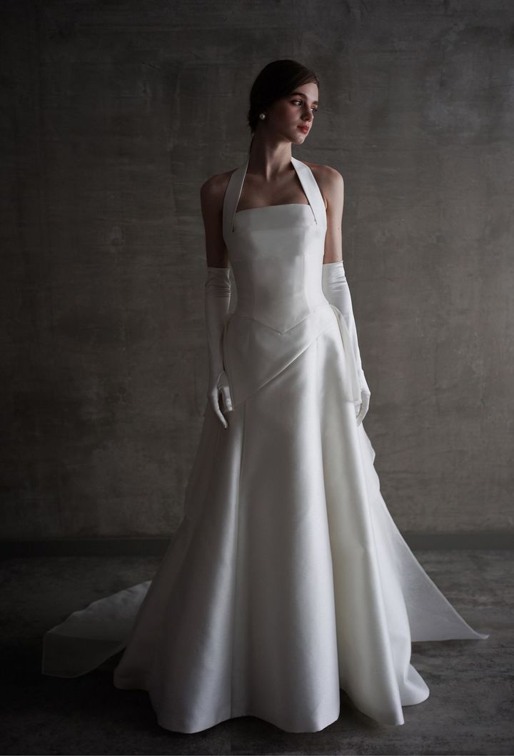 デザイナー、エマ理永さんの美意識を感じさせる一着。ホルターネックのデコルテまわりやウエストの切り替えなどエレガントでありながらエッジィな雰囲気も漂わせて。ドレス¥979,000(エマリーエ/エマリーエ ウエディングドレスサロン tel.03-6804-3090)