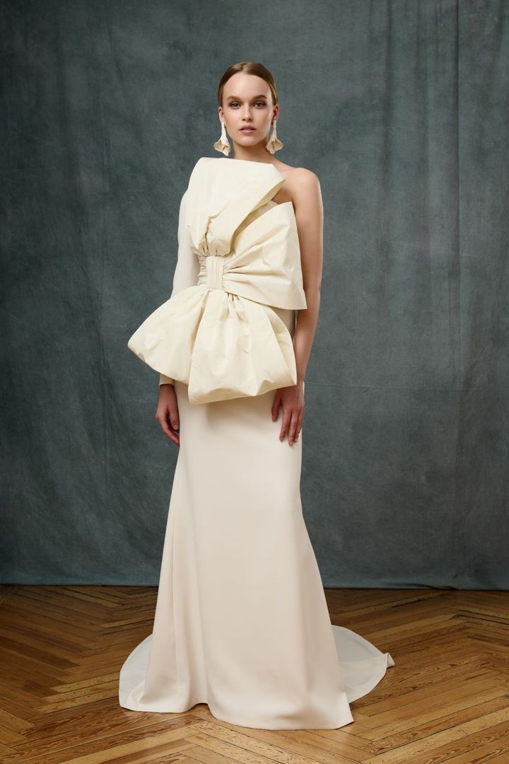 ボディはクレープ素材を使用したワンショルダードレス。タフタ素材で上半身に大きなリボンをデザインし、モダンでありながらとても華やかなブライズスタイル! ドレス¥460,900[レンタル価格](ザ・セカンド・スキン・コー/ドレスモア tel.06-6266-0069)