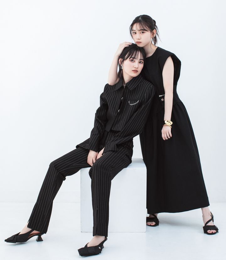山下さんが着たのは立体的なデザインが特徴のワンピース。的野さんはピンストライプのアイテムをセットアップで着用。どちらもメリハリのあるシルエットがモードな雰囲気を醸し出す。
