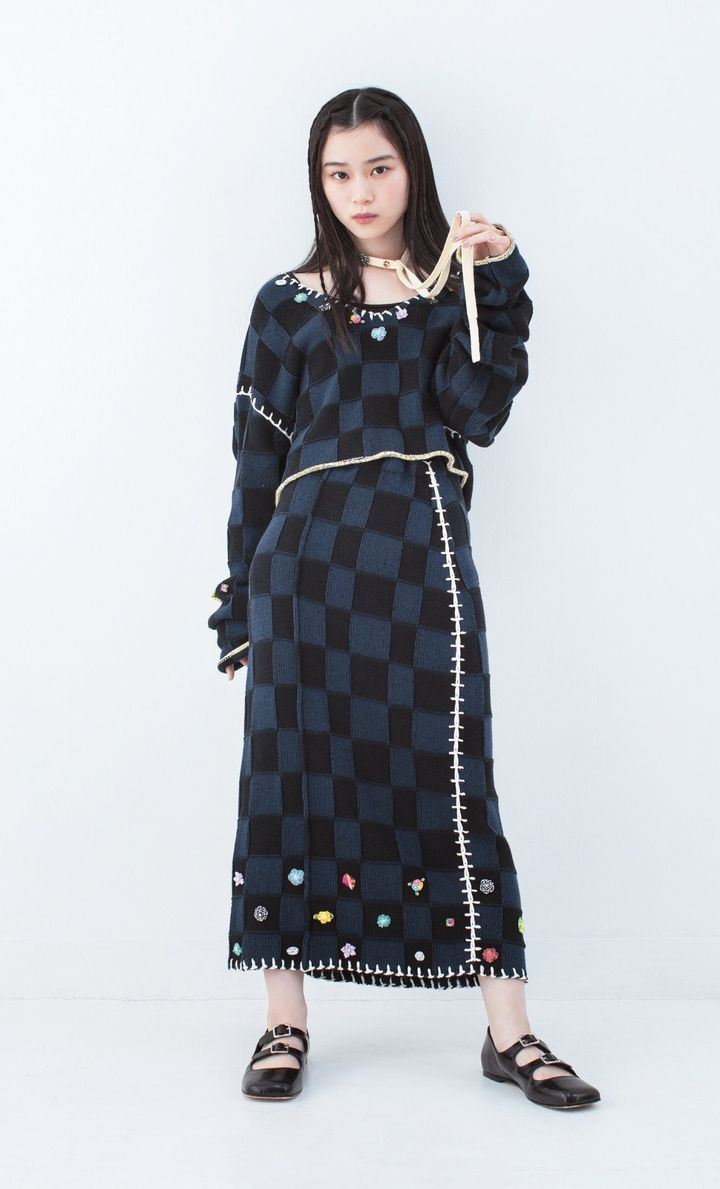 チョーカー¥17,600 トップス¥79,200 スカート¥86,900(以上ヤンヤン/リディア TEL:03-3797-3200) シューズ¥74,250(サンディ・リアング/リディア)「首まわりや裾に施されている花のパーツが可愛くてひとめぼれでした。こういう遊び心のあるアクセントが大好き。柔らかなニットで着心地が良いのも嬉しい」(山下さん)