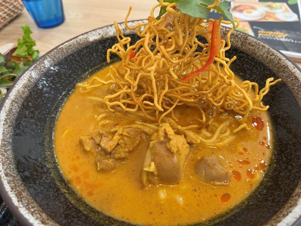 大きな器に美味しそうなカオソーイ!揚げた麺を乗せているのが特徴です