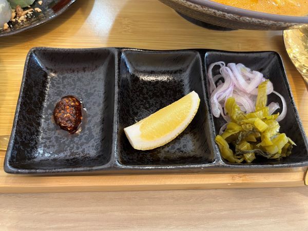 左:辛い調味料 中:レモン 右:高菜と玉ねぎのピクルス カオソーイを食べながら少しずつ入れて味変を楽しみます☆