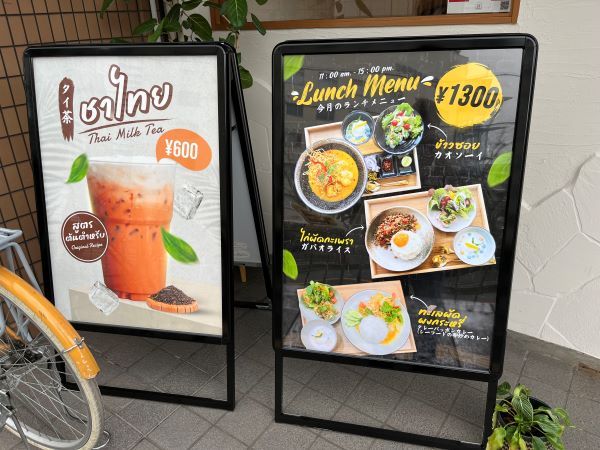 お店の前には大きくて見やすいメニューの看板があります。今月のランチはカオソーイ、ガパオライス、タレーバッポンカレーの3種類から選ぶ事ができるようです。楽しみですね☆さっそく中に入ります!