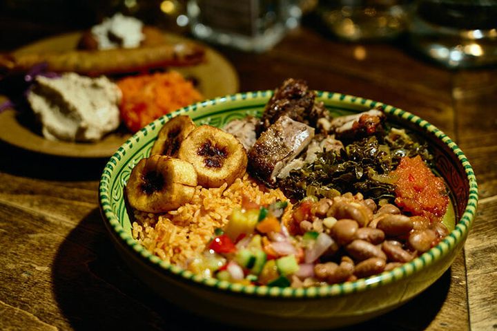 セネガルの「プーレヤッサ」や「マフェ」など、メニューに並ぶのはすべてアフリカ料理。まずは「ジョロフライス・ミール」1,800円を注文! トマトソースで炊き込んだ西アフリカの炊き込みご飯だ。トマトの酸味とココナッツの甘い風味が渾然一体となった優しい味わいが、不思議と後を引く。付け合わせの鶏肉のグリルやケール、豆煮込み、揚げバナナ、刻み野菜のサラダを混ぜながら食べると、一皿でいろんな味や食感を楽しめるのも魅力だ。