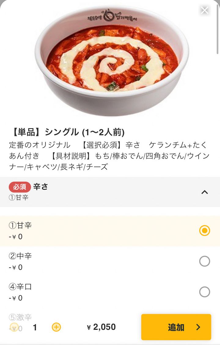 今回は、目的のブンモジャをシングルのトッポッキにトッピング。辛さは5段階から選べるので、初回の今回は1番辛くない「甘辛」をチョイス。また、トッポッキと韓国おでんの割合も選べるので、半分ずつの割合にしてみました。