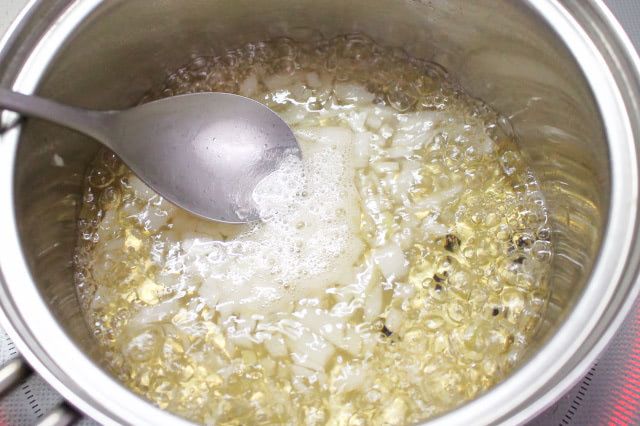 2分ほど中火で加熱すると沸騰し、酢の酸っぱい香りと白ワインの芳醇な香りが強く広がりました。玉ねぎからあくが出たので、スプーンで取り除きました。